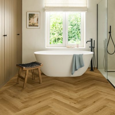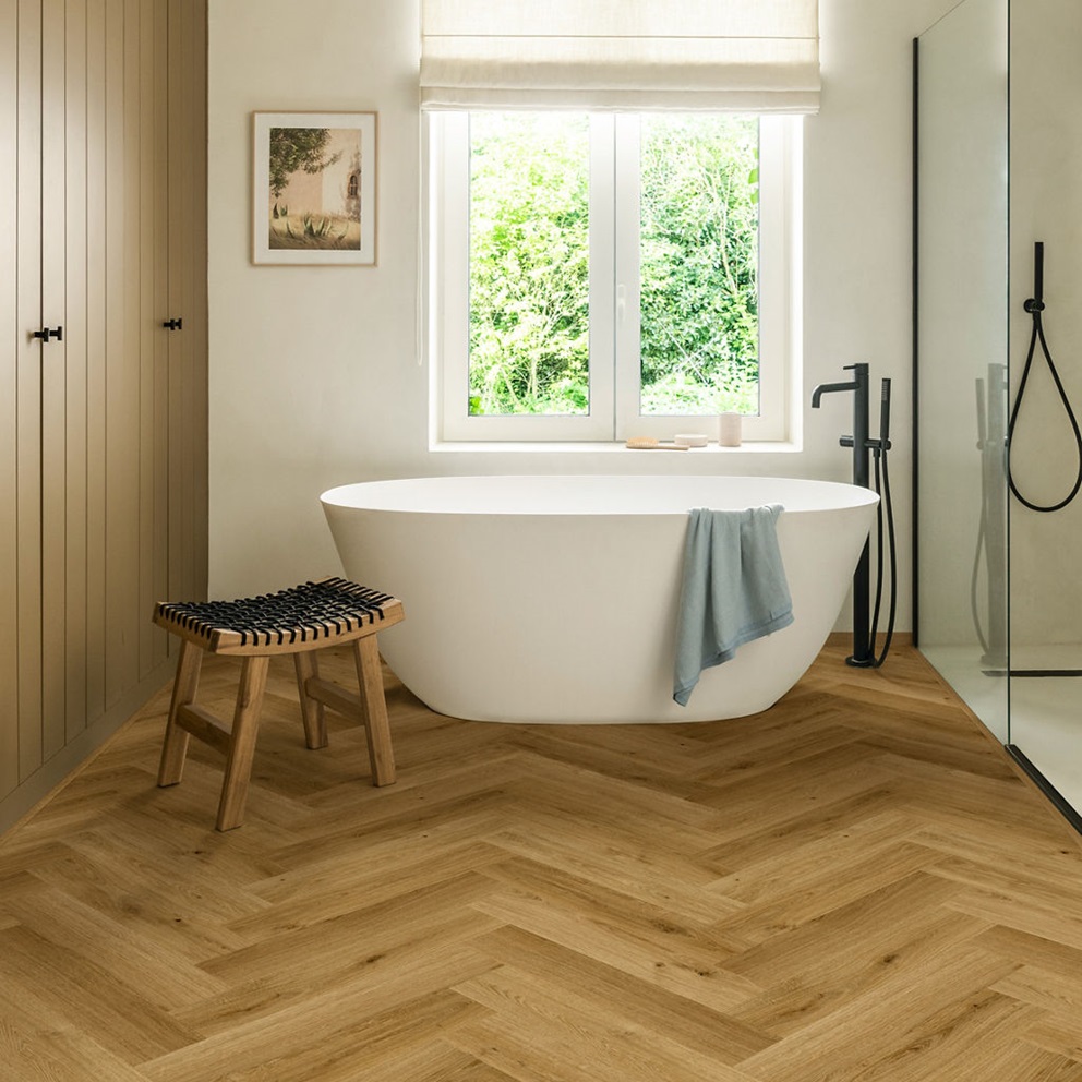 Bề mặt sàn được hoàn thiện với thiết kế vát cạnh Authentic Bevel, giúp từng tấm ván hiện lên rõ ràng và tạo chiều sâu thị giác khi lắp đặt. Cấu trúc herringbone (xương cá) mang lại sự sắp xếp hài hòa, vừa nâng cao tính thẩm mỹ, vừa giữ được nét ấm cúng và gần gũi cho tổng thể không gian.